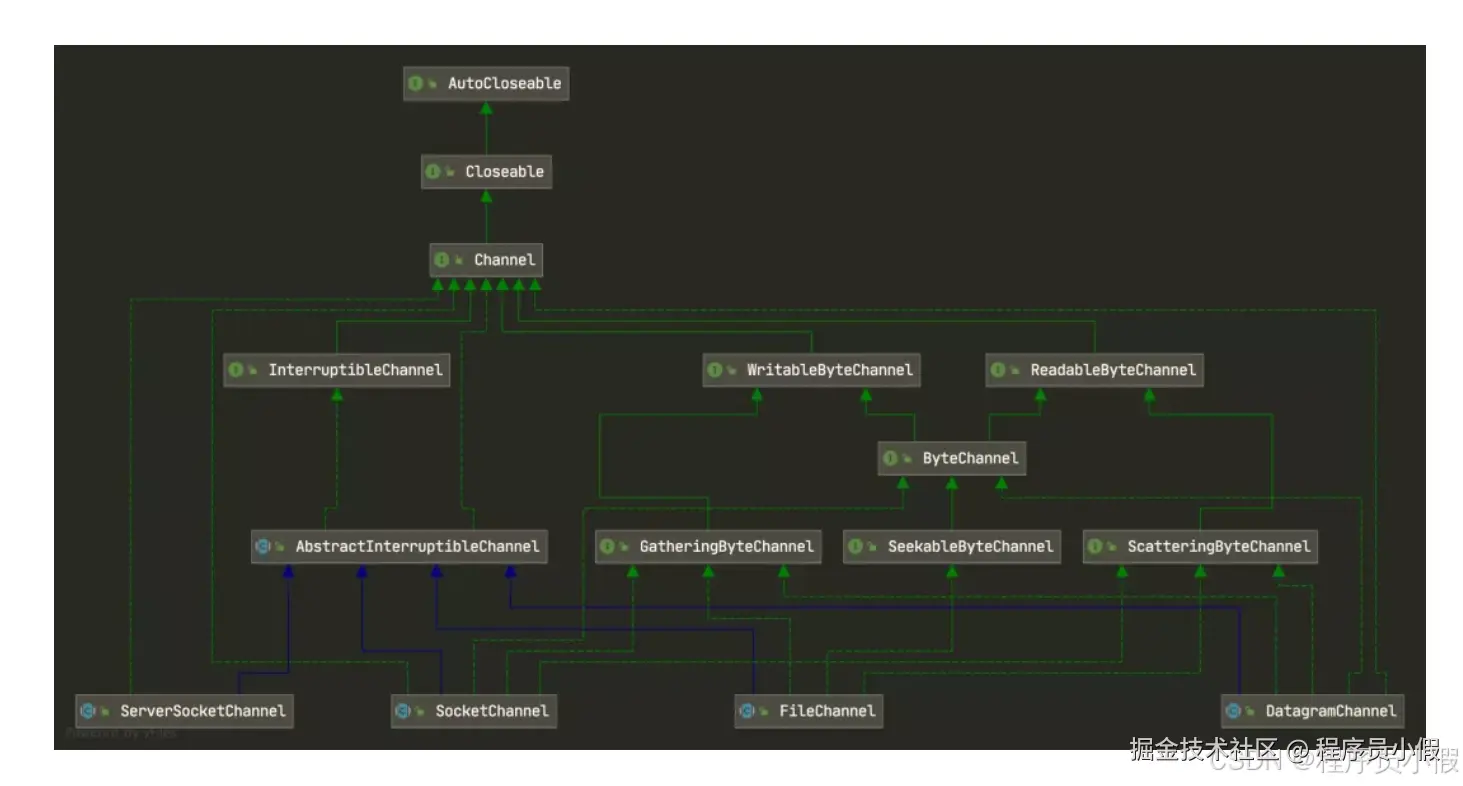 FileChannel:文件通道,用于文件的数据读写。SocketChannel:套接字通道,能通过 TCP 读写网络中的数据。ServerSocketChannel:服务器套接字通道,监听新进来的 TCP 连接,像 web 服务器那样,对每一个新进来的连接都会创建一个SocketChannel。DatagramChannel:数据报通道,能通过 UDP 读写网络中的数据。