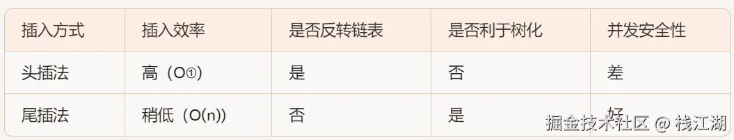 HashMap本身不是线程安全的,它的设计目标是在 单线程 下提供高性能的键值存储。JDK 1.7 的头插法在单线程下没有问题,只有在多线程并发扩容时才会出现链表环。- 插入效率高: 头插法只需要修改一个指针(新节点的