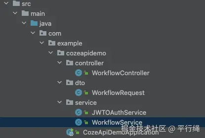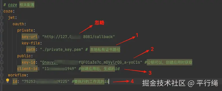 文章到这里已经获取到鉴权需要的 token 了,就可以直接调用 Coze 工作流了,我服务端使用的是 SpringBoot 框架,已经将代码整理好了,就直接看代码。先看下配置内容