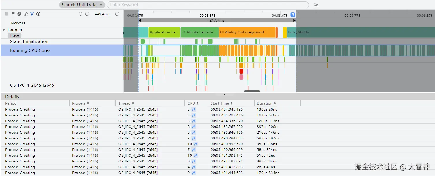 展开“Launch”泳道,其中的“Running CPU Cores”子泳道展示启动过程中的关键线程具体运行在哪个CPU核心。