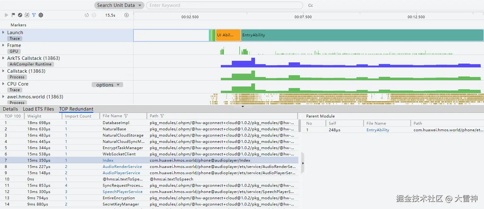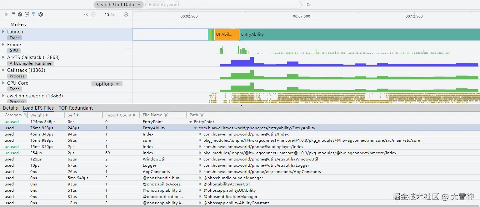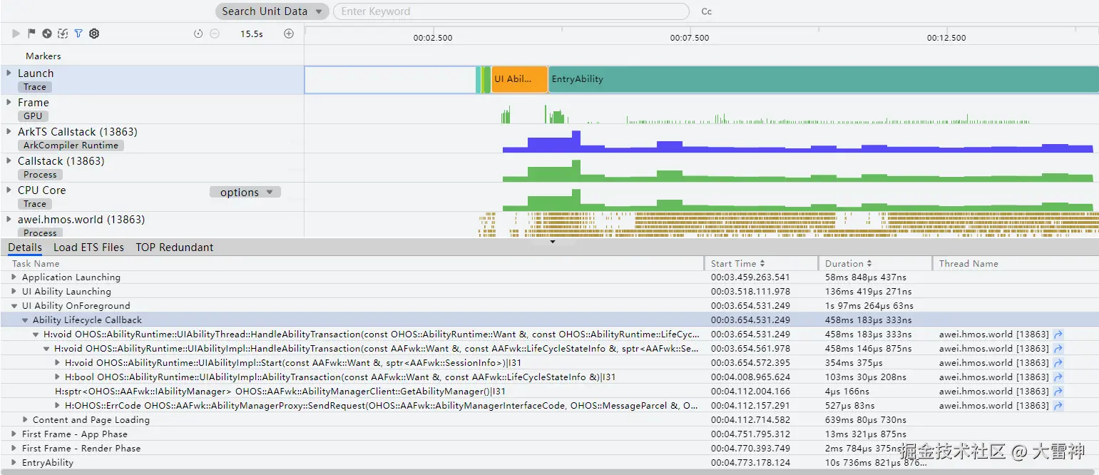 开发应用或元服务过程中,启动速度是很重要的一个指标。如果开发者需要分析启动过程的耗时瓶颈,优化应用或元服务的冷启动速度,可使用DevEco Profiler提供的Launch场景分析能力,录制启动过程中的关键数据进行分析,从而识别出导致启动缓慢的原因所在。此外,Launch任务窗口还集成了Time、CPU、Frame、Network场景分析任务的功能,方便开发者在分析启动耗时的过程中同步对比同一时段的其他资源占用情况