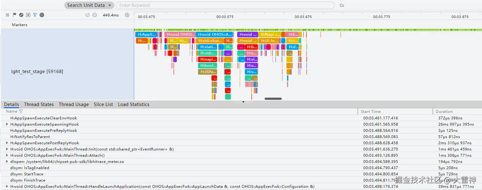 2:单击“Launch”泳道上的单个阶段,或框选多个阶段,在下方的“Details”页签中,可查看到所选阶段的耗时统计情况。展开各阶段的统计信息折叠表,可以看到各个任务的具体耗时信息。单击跳转按钮,可直接跳转至相关线程打点任务中。