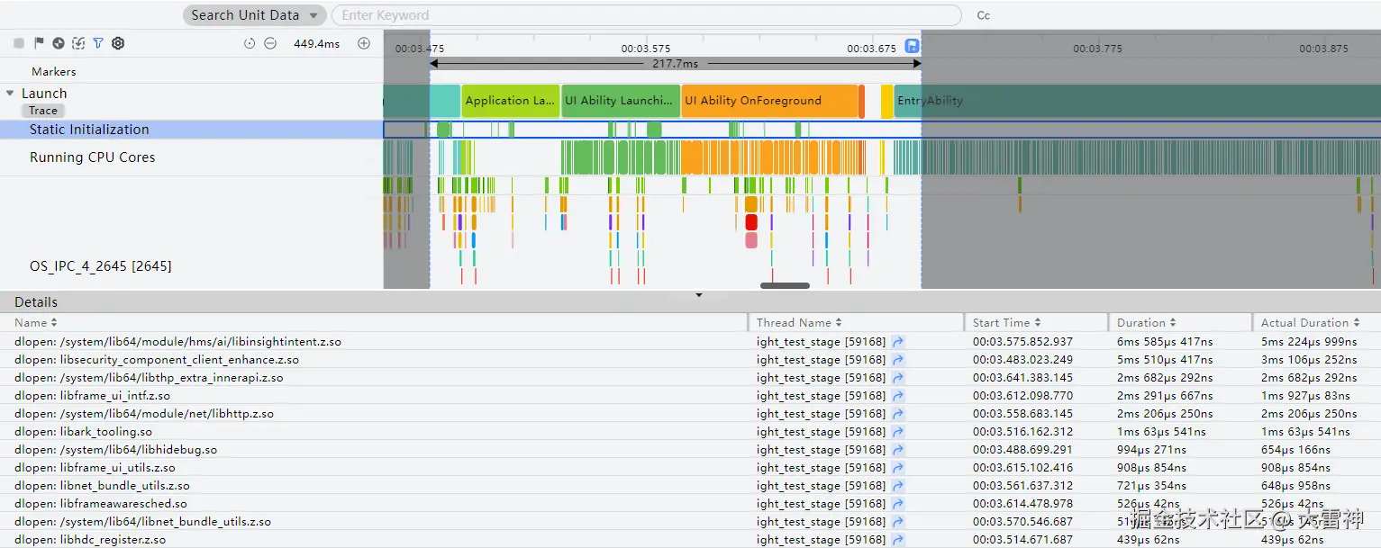 展开“Launch”泳道,其中的“Static Initialization”子泳道展示启动过程中各静态资源库的加载耗时。