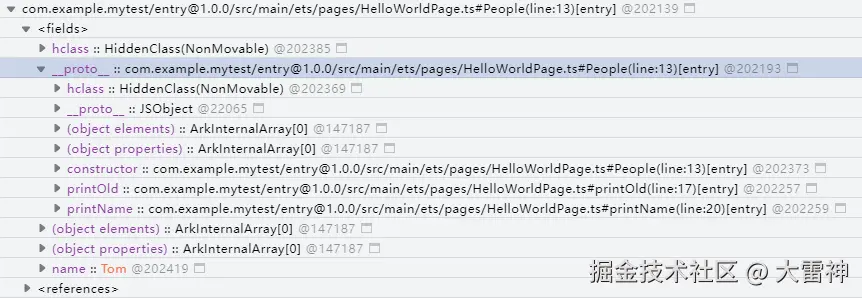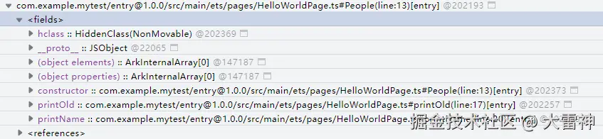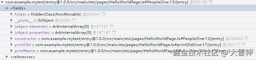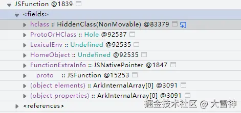 其中HomeObject表示父类对象,即该方法属于哪个对象;_proto_表示原型对象;LexicalEnv表示该函数的闭包上下文;name是内置属性访问器,可获取函数名;FunctionExtraInfo表示额外信息,比如一些napi接口会在这里记录函数地址;ProtoOrHClass表示原型或者隐藏类。