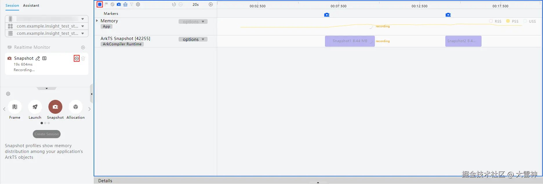 连接设备后启动应用,点击应用选择框选择需要录制的应用,选择Snapshot模板,点击Create Session或双击Snapshot图标即可创建一个Snapshot的录制模板。