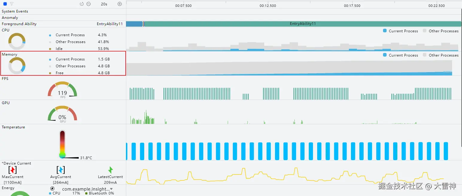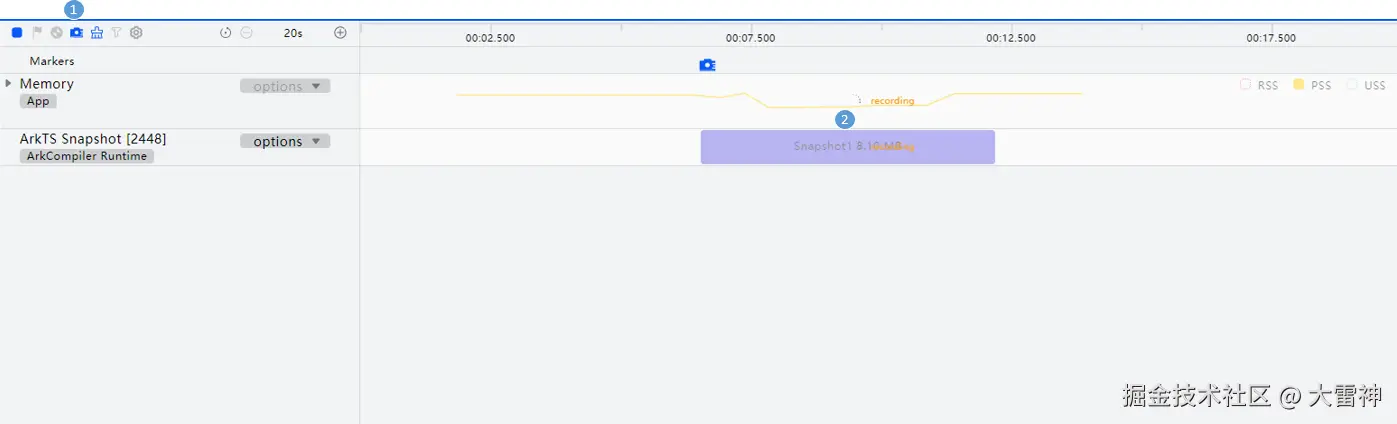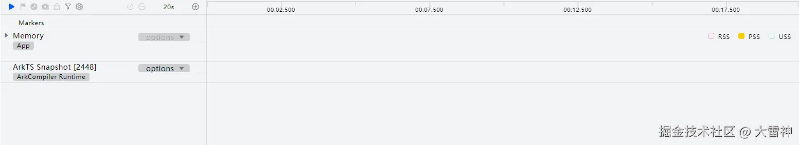 当ArkTS Heap有明显的上涨,说明在方舟虚拟机内的堆内存上可能存在内存泄漏,可以使用Snapshot模板进行下一步分析;当Native Heap有明显的上涨,说明Native内存上可能存在内存泄漏,可以使用Allocation模板进行下一步分析。