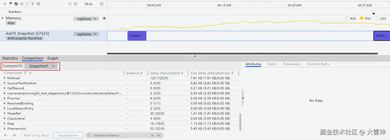 - 对比两次快照的数据,可快速找到泄漏对象并做进一步分析;
