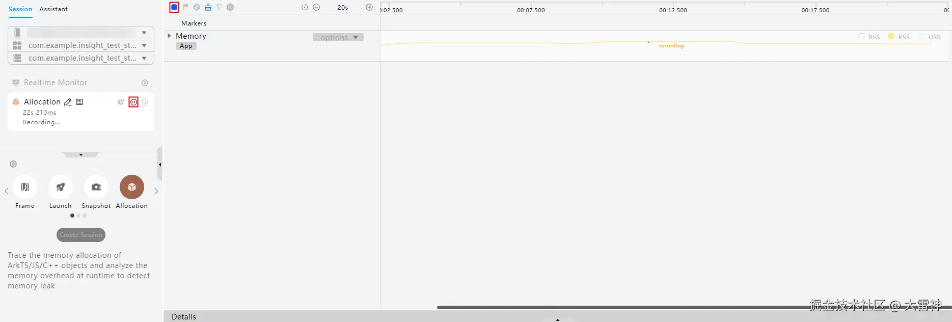 当从实时监控页面初步判断应用可能存在内存问题后,可以使用Memory泳道来抓取应用内存在问题场景下的详细数据以及变化趋势,初步定界问题出现的位置。Memory泳道存在Allocation或Snapshot模板中,使用Allocation或Snapshot模板录制均可。