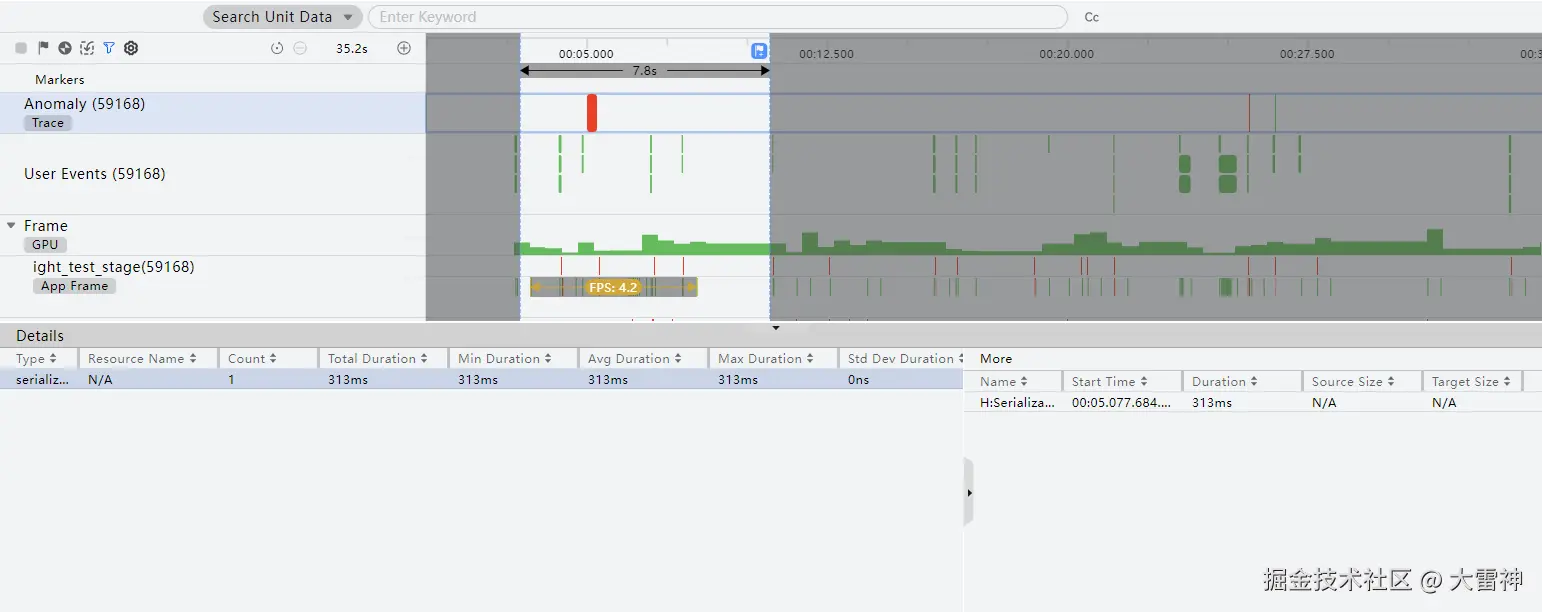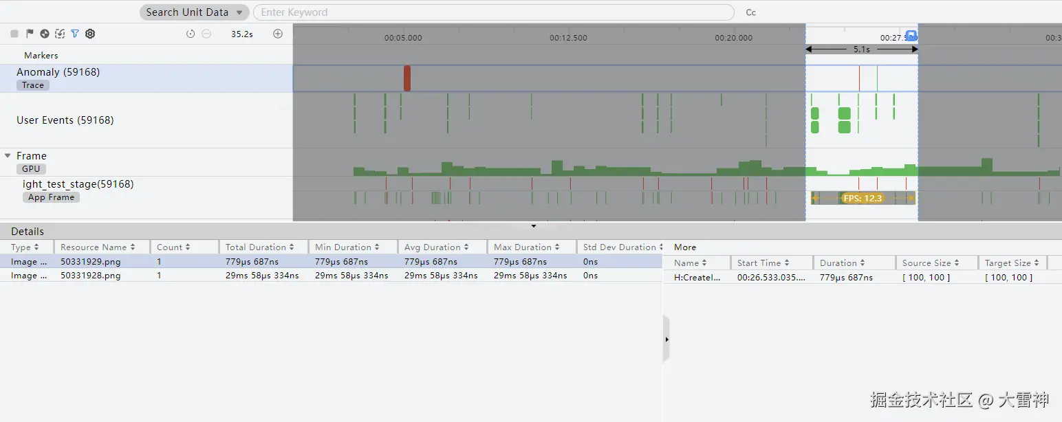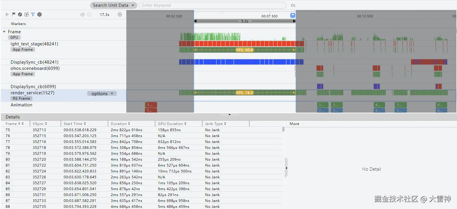 窗口下方的“Details”区域中会显示选定时间段内的RS帧统计信息列表,体现各帧的起始时间、总耗时、GPU耗时以及卡顿丢帧类型。