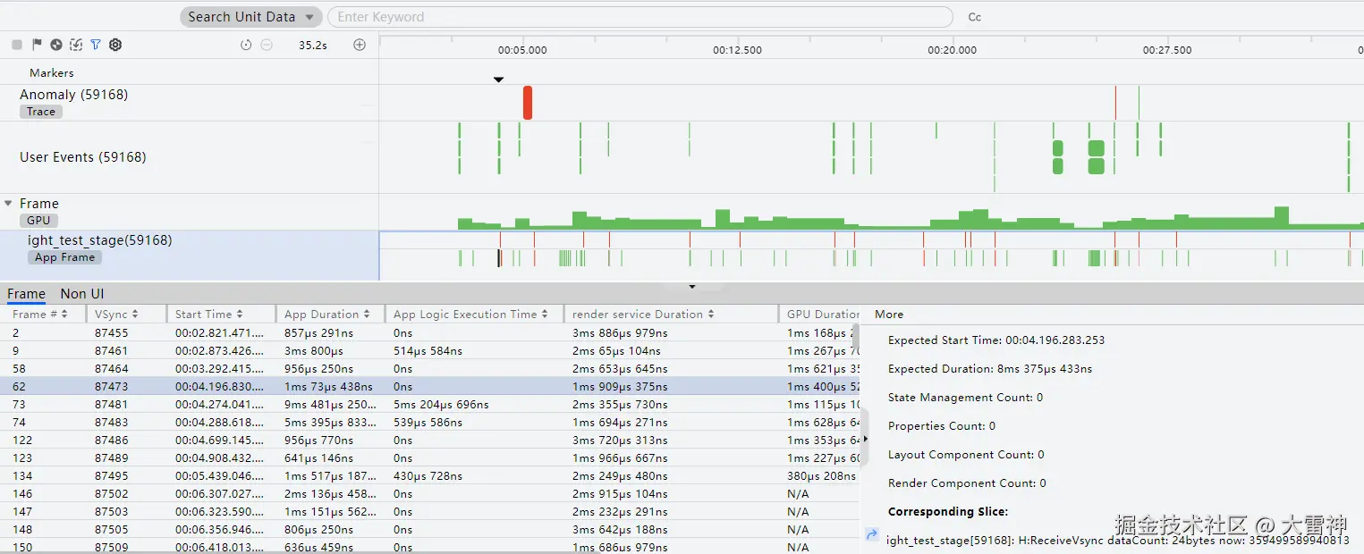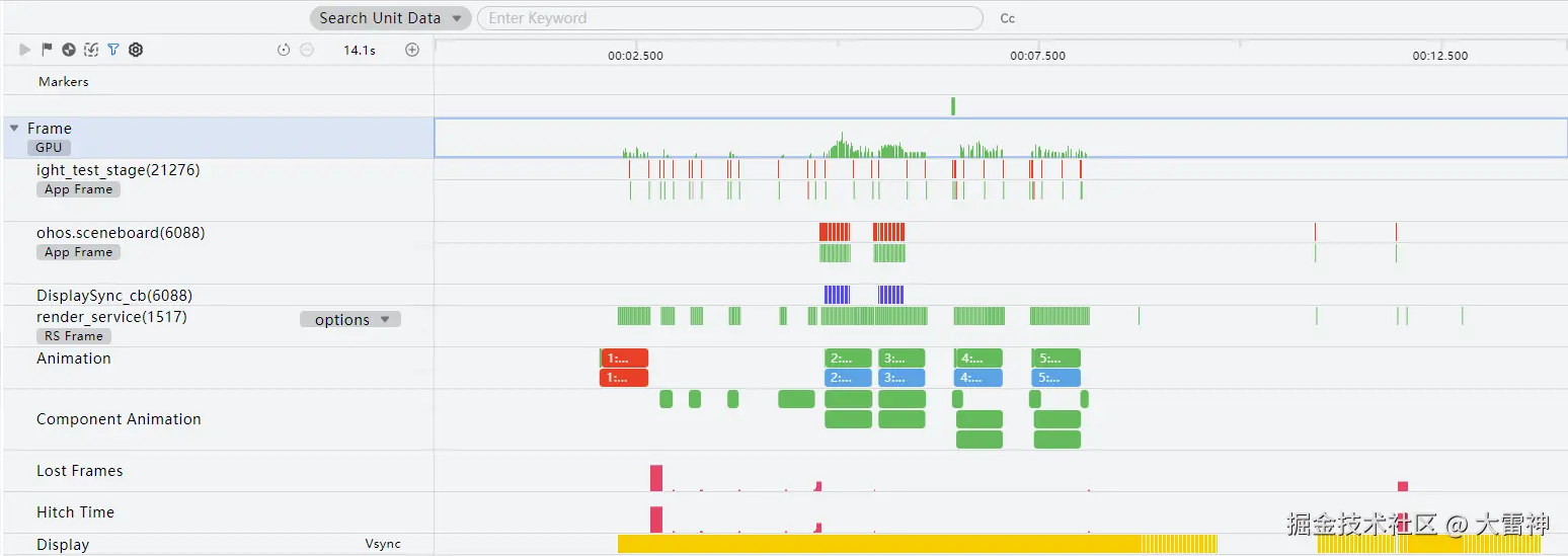 - 在“RS Frame”和“App Frame”标签的泳道中,正常完成渲染的帧显示为绿色,出现卡顿的帧显示为红色。