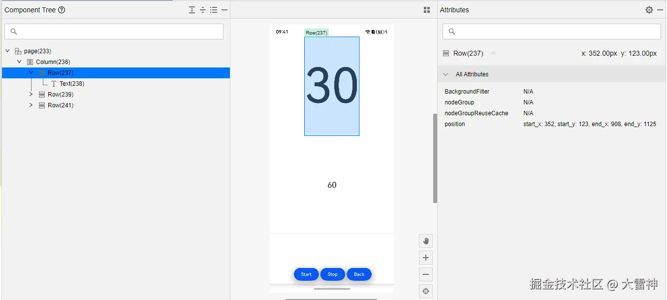 在ArkUI Inspector中可查看组件树和组件属性信息,当前支持BackgroundFilter、nodeGroup、nodeGroupReuseCache等组件属性: