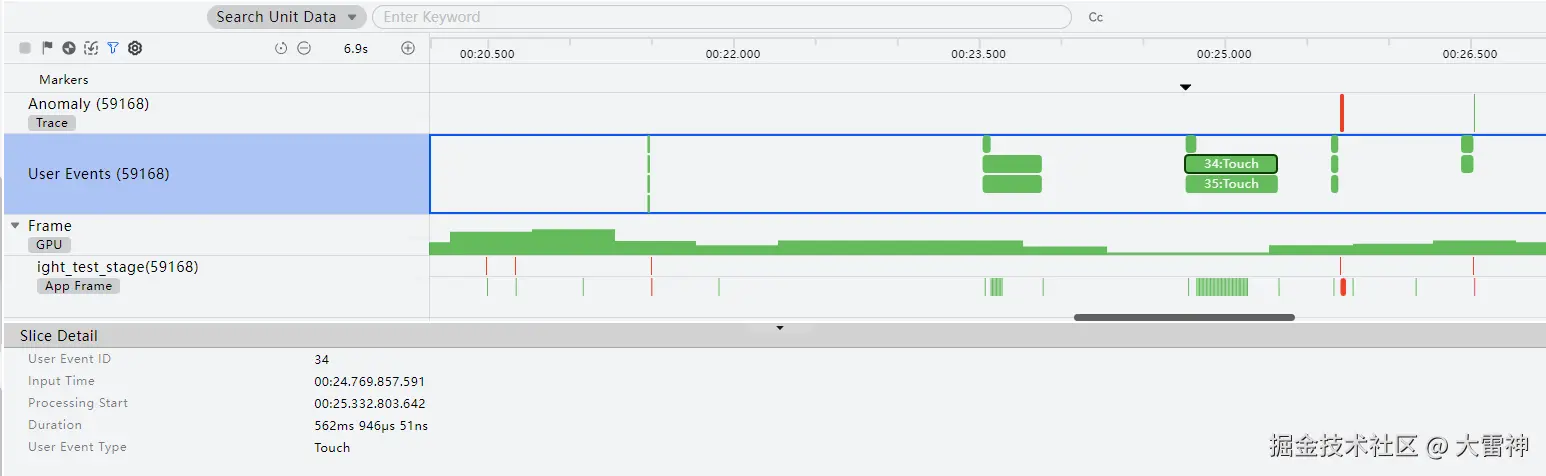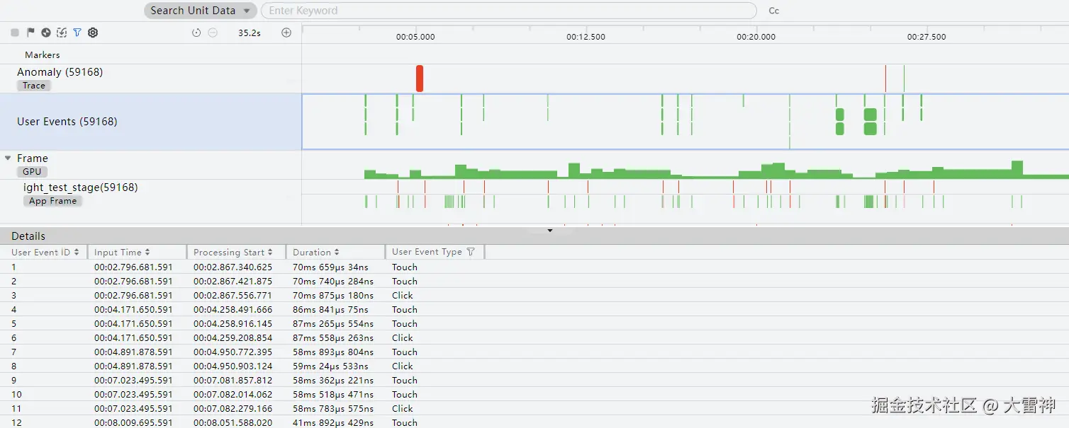 开发者在卡顿丢帧场景可通过User Event用户事件,查看用户事件开始时间、应用开始处理时间以及应用处理耗时等情况。