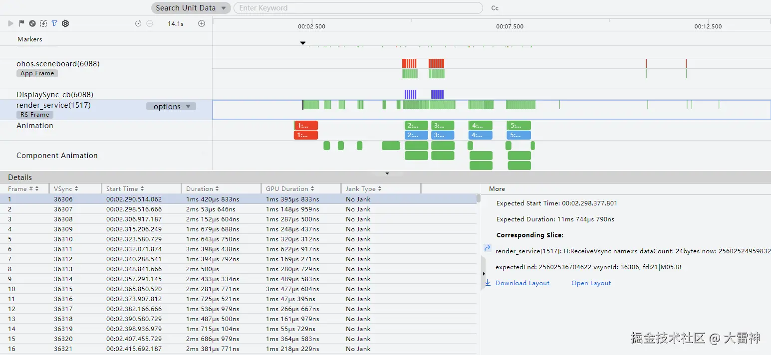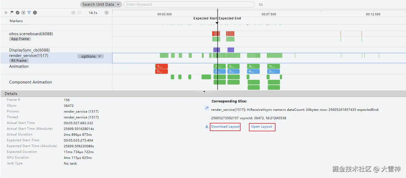 单击RS Frame泳道或APP Frame泳道中任意一帧,”Details”区域中会展示该帧具体信息。单击Download Layout或Open Layout按钮,下载或打开页面布局信息。点击Open Layout按钮,将在ArkUI Inspector中直接打开相应arkli文件。点击Download Layout将arkli文件下载保存到指定目录,之后可手动导入ArkUI Inspector查看页面布局信息。