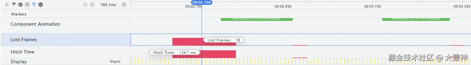 创建Frame模板并录制会话,如存在卡顿和丢帧现象,会在Lost Frames和Hitch Time泳道对应时间显示矩形图。