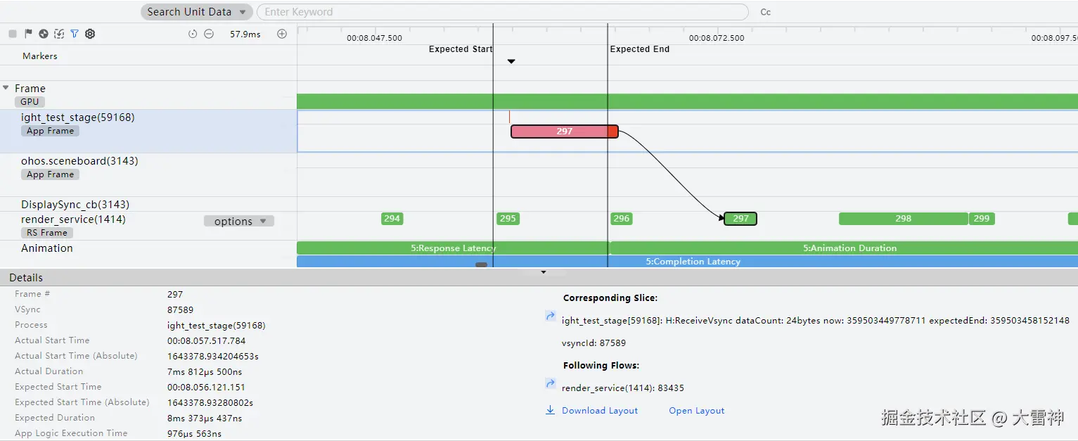 - 如果该帧是由于超出期望结束时间引起的,则显示两条线,对应期望开始时间(Expected Start)和期望结束时间(Expected End),用于关联分析同一时刻Trace或者函数采样信息。