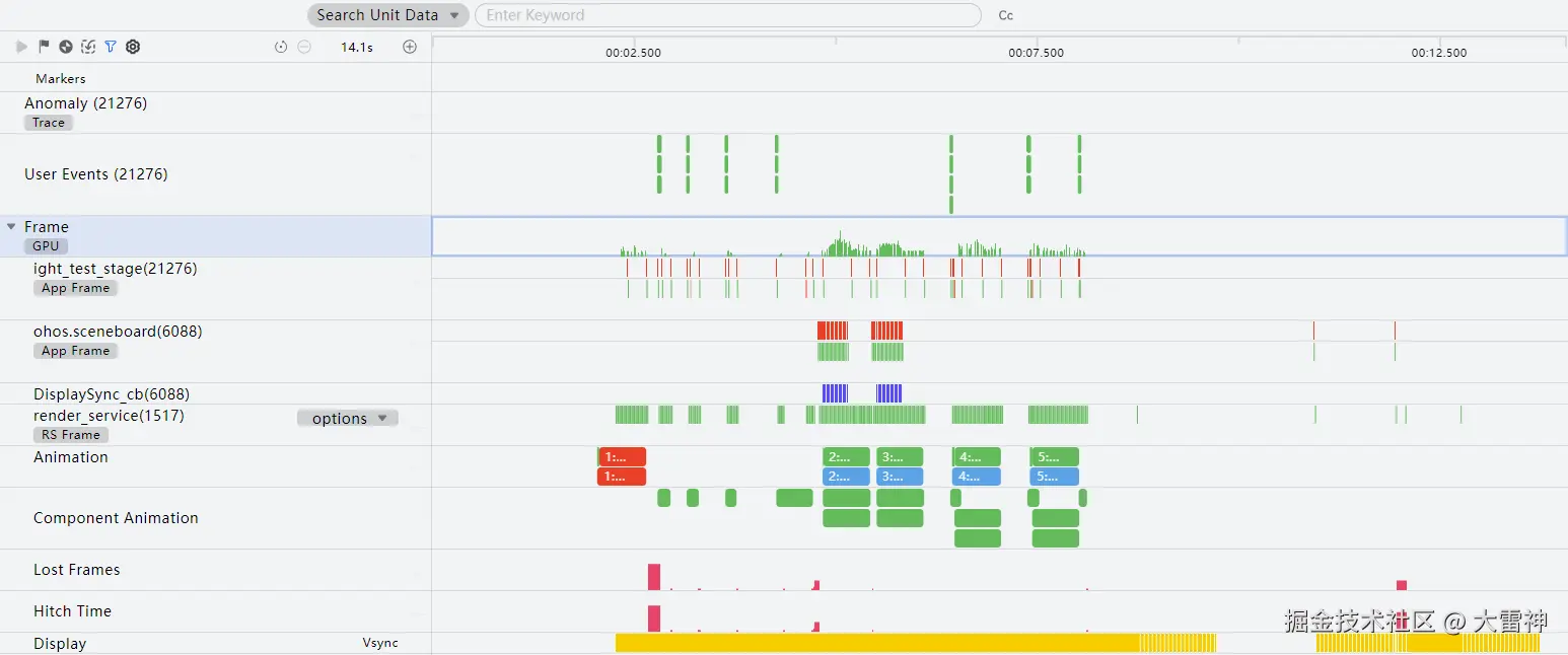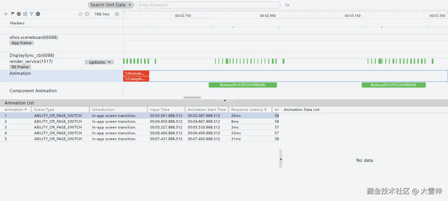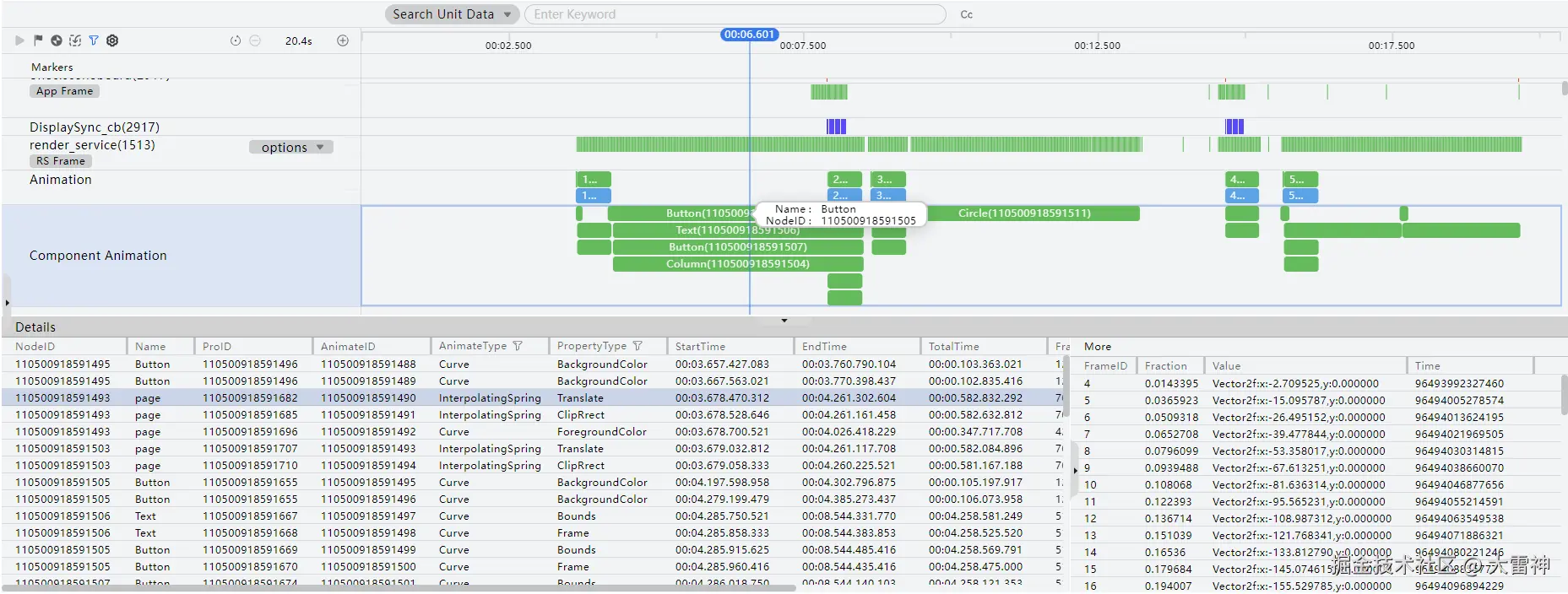 从DevEco Studio 6.0.0.828版本开始,Frame泳道下新增Component Animation子泳道,用于从组件的角度展示应用中包含的各种动画类型,包括属性动画 (animation)、显式动画 (animateTo)、关键帧动画 (keyframeAnimateTo)以及页面间转场 (pageTransition)。