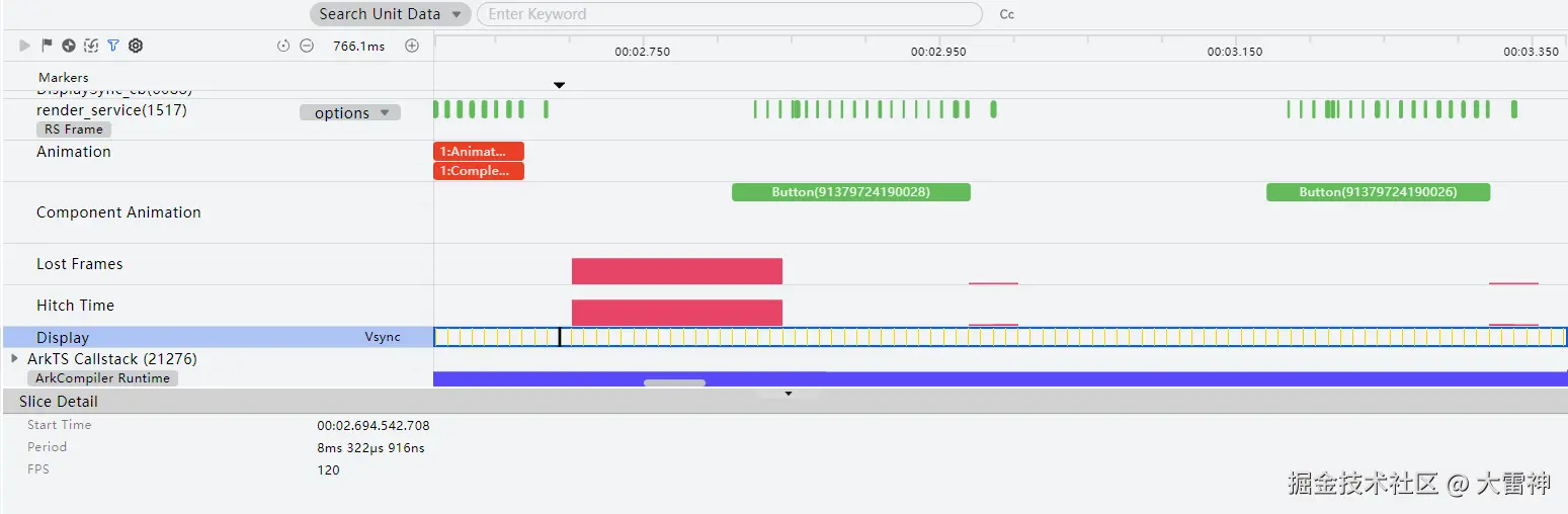 同时如果组件有可能的掉帧情况,DisplaySync_cb泳道显示对应的掉帧情况并标红展示。