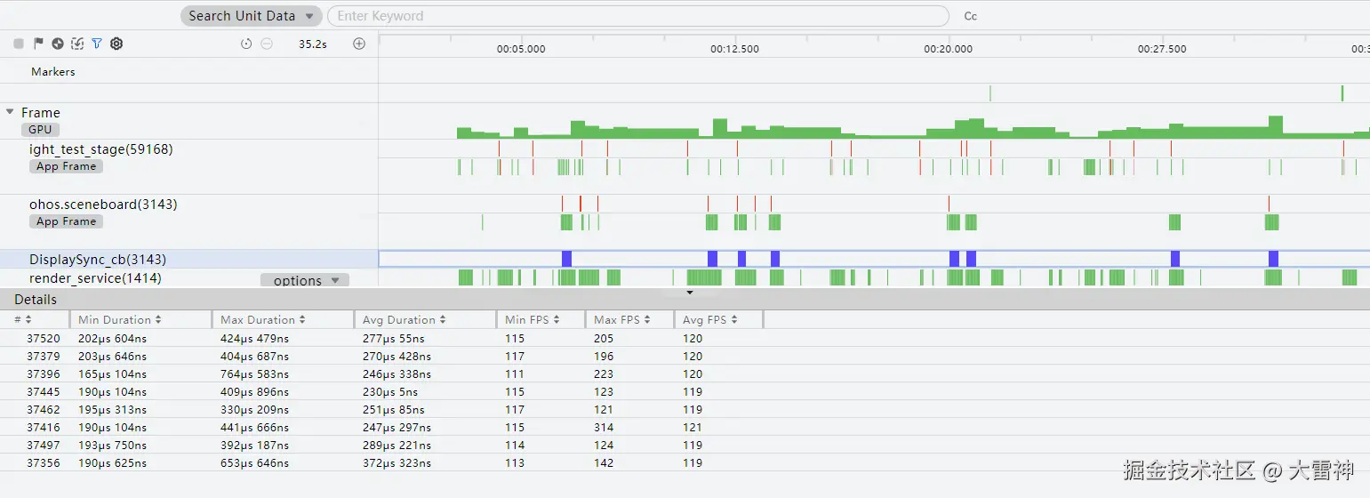 显示Render Service(渲染服务)侧的帧数据。同样用颜色标识正常与卡顿帧。