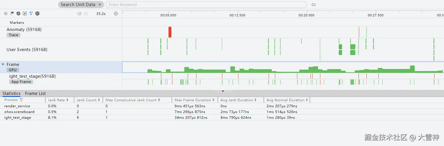 窗口下方的“Statistics”区域中会以进程维度对选定时间段内的Frame信息进行统计,包括卡顿率、卡顿次数、最大连续卡顿次数、最大卡顿耗时、平均卡顿耗时以及平均正常耗时等。