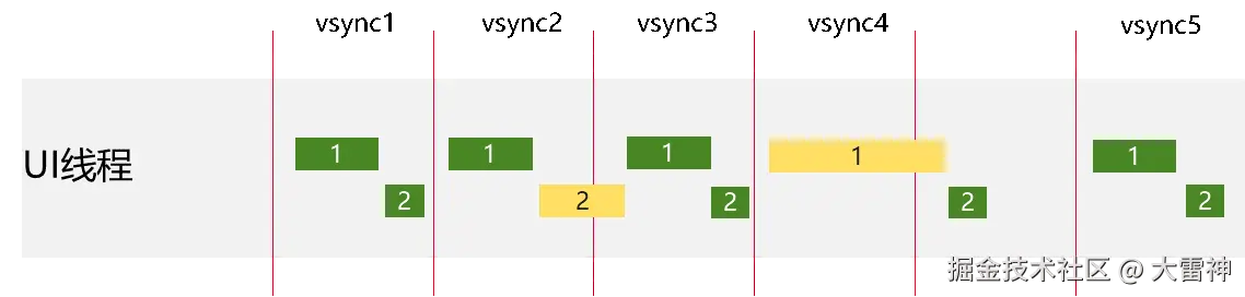 如下图所示,vsync2和vsync4中,vsync周期内的组件由于渲染耗时长,导致以下两个vsync周期挤掉下一个vsync周期的渲染时间,导致掉帧的情况产生。