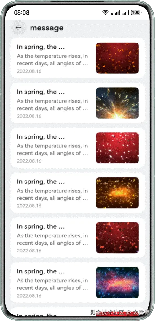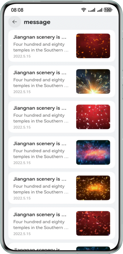 @Builder private getListView() { List({ space: 12, scroller: this.scroller }) { // Render data using lazy loading components ForEach(this.newsData, (item: NewsData) => { ListItem() { newsItem({ newsTitle: item.newsTitle, newsContent: item.newsContent, newsTime: item.newsTime, img: item.img }) } .backgroundColor(Color.White) .borderRadius(16) }, (item: NewsData) => item.newsId); } .width('100%') .height('100%') .padding({ left: 16, right: 16 }) .backgroundColor('#F1F3F5') // You must set the list to slide to edge to have no effect, otherwise the pullToRefresh component's slide up and drop down method cannot be triggered. .edgeEffect(EdgeEffect.None) }