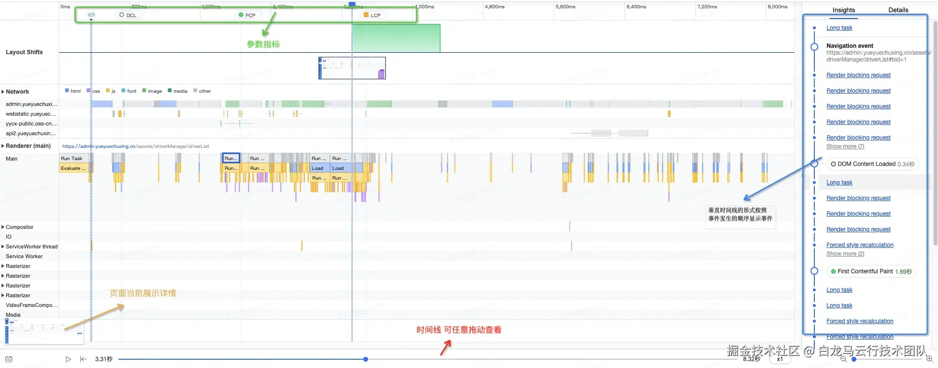 Performance insights 是 Chrome Chrome DevTools中的自带工具(Chrome102 版本发布),目前还是在Chrome DevTool中启动即可,如下图所示:我们可以模拟cpu,选择4x slowdown,就开始模拟4倍低速 CPU,同理还可以模拟网络应对不同网络的测试需求。 Performance insights 工具最方便的部分是"insights"面板,它位于面板的最右侧。它以垂直时间线的形式按照事件发生的顺序显示事件,如渲染阻塞请求、长任务、布局变化等。点击这些具体事件将导航到"详细信息"选项卡,它给出了关于它的潜在原因和受它影响的元素等的详细信息,在Details中看到影响性能问题的各种因素。想要进一步进行优化,点击该事件就可以查看关于问题的详细描述和具体的优化方案。另外在页面的顶端(绿色框)我们可以方便的看到当前页面DCL,FCP,LCP和TTI这些参数指标