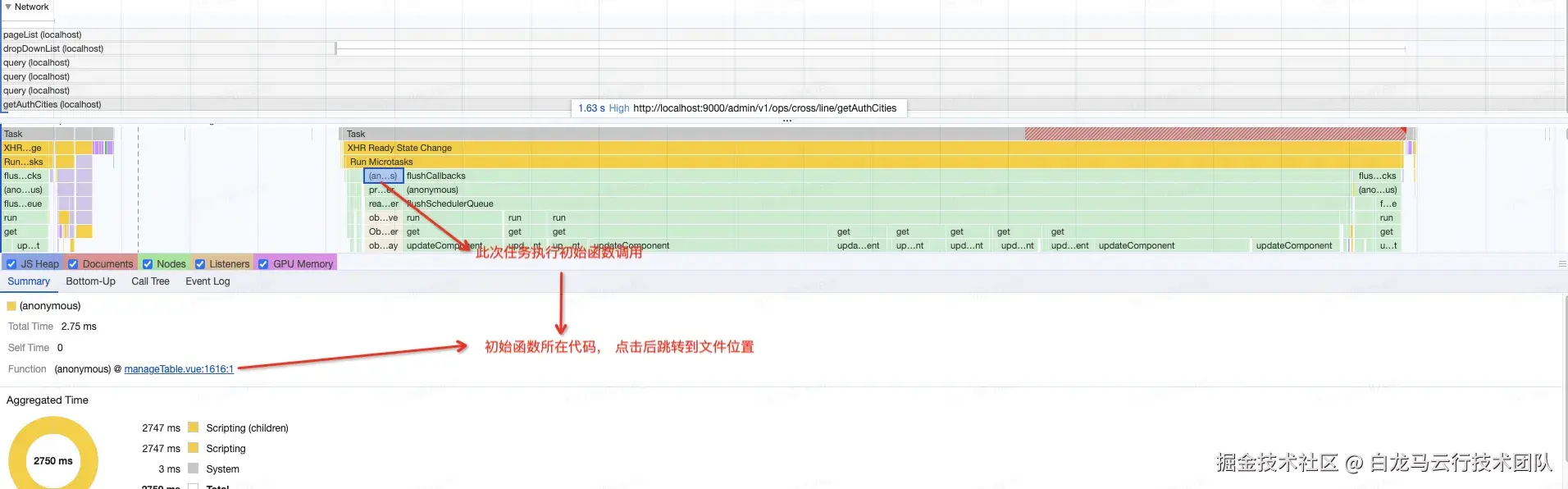 - 主要通过以上三步确定阻塞点并进行分析。若想深入分析阻塞点的具体原因,可在本地环境中使用 Performance 进行分析(可获取具体函数调用栈),或使用 Profiles(在 Memory 标签下)进行分析,以确定哪些函数导致了内存占用的波动等问题。