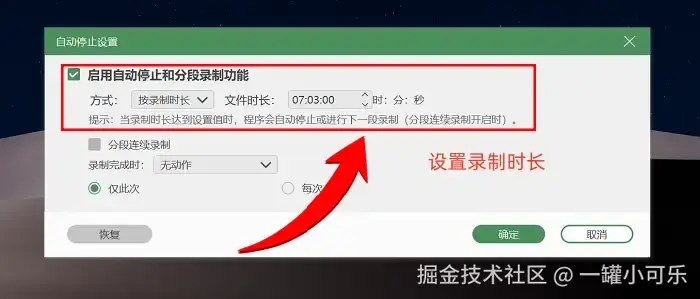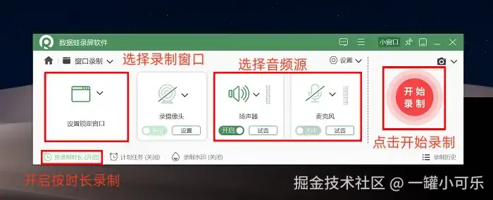 步骤2:关键设置不可忽视。首先划定需要录制的屏幕区域,比如仅选取一个视频窗口,以避免画面杂乱。接着选择音频来源,可以根据需求勾选电脑声音、麦克风声音,或同时录制两者。若担心忘记停止录制,可以提前设置 “按时长录制” 功能。完成所有设置后,点击 “开始录制” 即可。