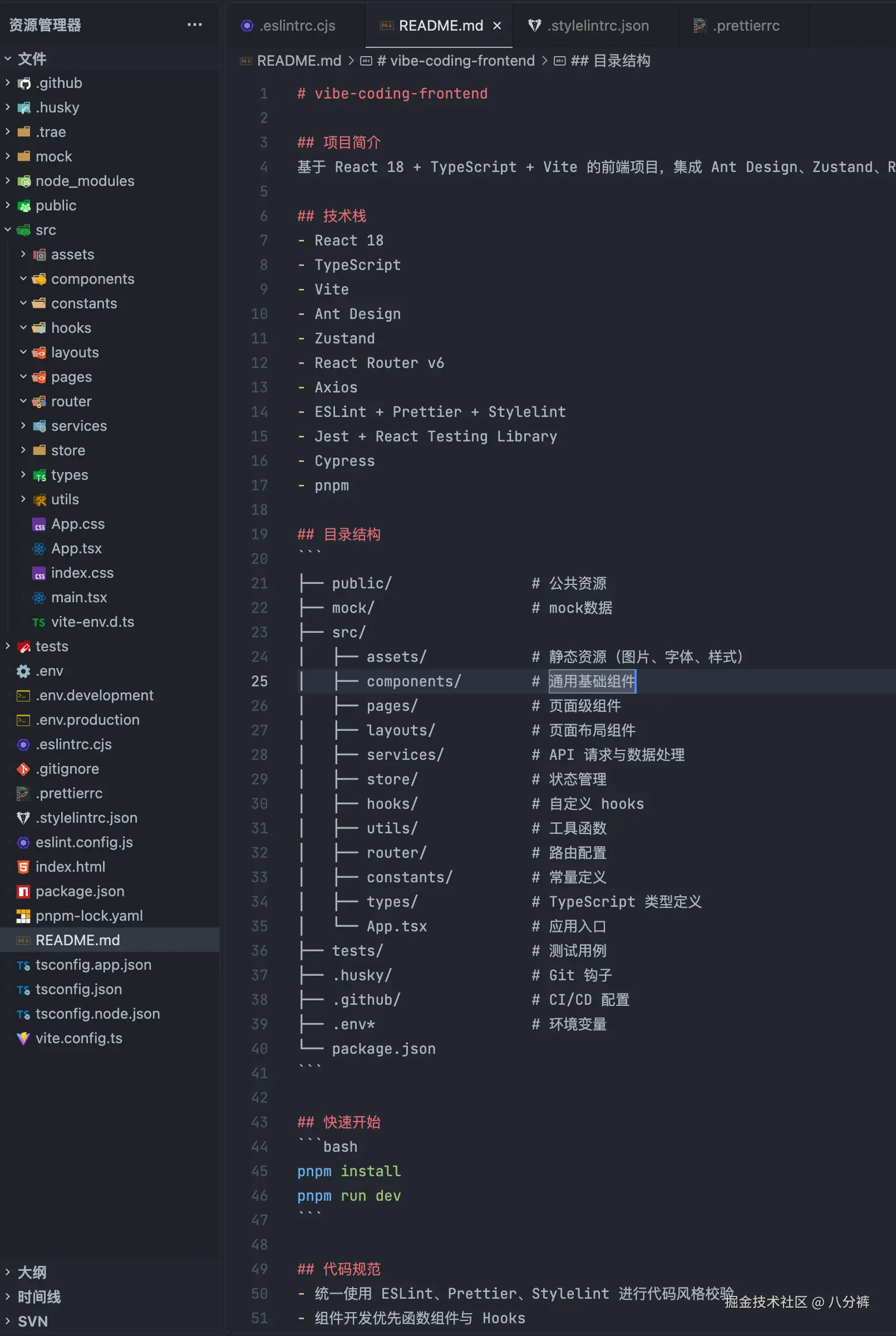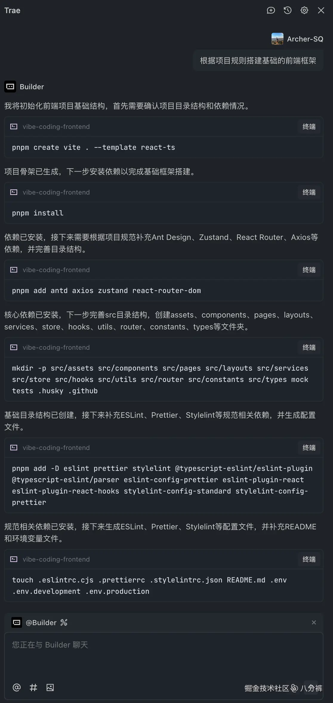 提示词:“ 我现在要开发一个前端项目,以大厂的前端架构为标准来制定项目规则供智能体使用,需要在项目规则中加上项目的技术选型,框架结构等”