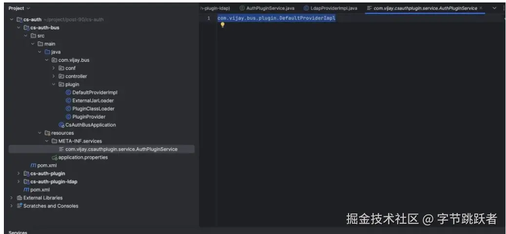 2.resources目录下创建META-INF/services目录并在目录下创建一个名为SPI接口类全路径限定名的文件com.vijay.csauthplugin.service.AuthPluginService,文件内容为DefaultProviderImpl全路径限定名com.vijay.bus.plugin.DefaultProviderImpl编辑