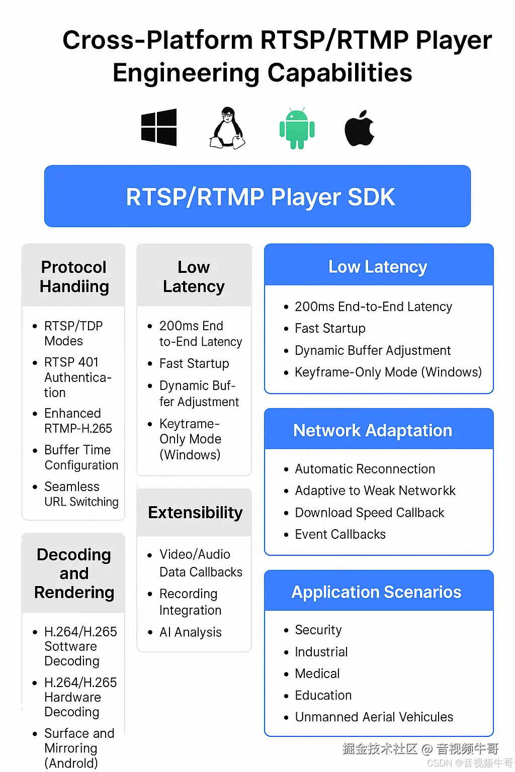 大牛直播SDK正是在这种背景下不断迭代,其 RTSP/RTMP 播放器 SDK 历经多年优化,已经在安防监控、工业巡检、远程医疗、智慧教育、低空经济等对实时性要求极高的行业落地,形成业内领先的 低延迟、高性能、全平台适配能力。本文将从协议、延迟控制、解码渲染、网络适配与扩展性等多个维度,剖析为什么开发一个真正可用的播放器,比想象中难得多。