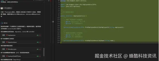 我的操作:在文心快码的IDE插件界面,我直接输入自然语言描述:“生成一个SpringBoot接口,根据员工姓名或工号查询个人信息、考勤和部门数据,需要关联MySQL中的employee、attendance和department表。”