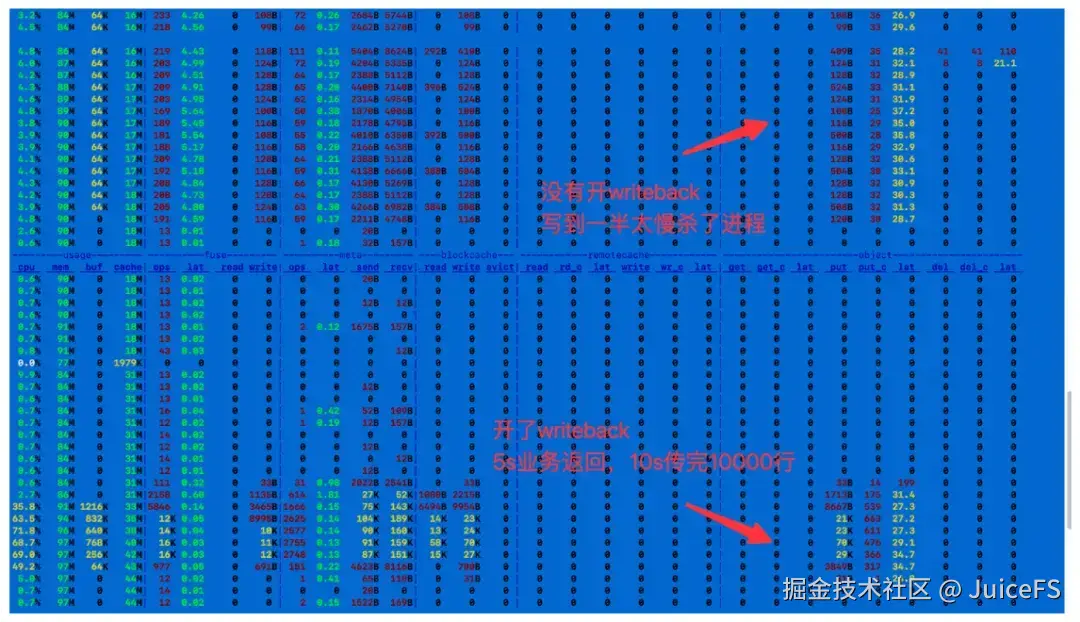 为了提升写入效率,JuiceFS 提供了 writeback 功能。例如在写入 1 万条数据的案例中,启用 writeback 后,数据传输在 10 秒 内完成;未启用 writeback 时则需要 2 分钟。然而,writeback 功能也伴随着一些风险和使用限制。本文将详细介绍 JuiceFS 的写入机制,解析 writeback 的工作原理、适用场景以及使用时的注意事项,帮助用户全面了解该功能的优势与潜在问题。