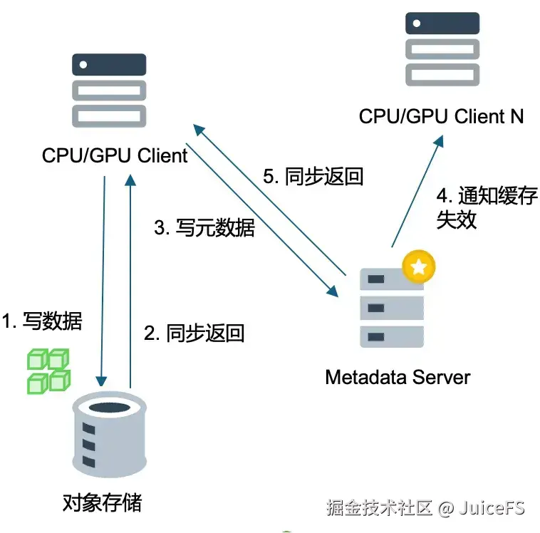 - 元数据写入: 对象存储返回响应后,JuiceFS 接着写入元数据。