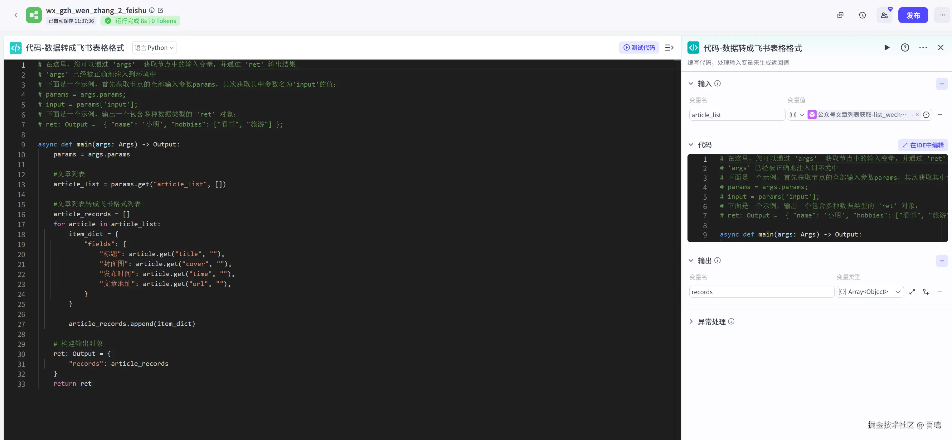 这里使用到了扣子官方的“代码”类型节点,主要是把提取到的文章列表转成飞书表格所需要的格式。它的输入输出参数如下: