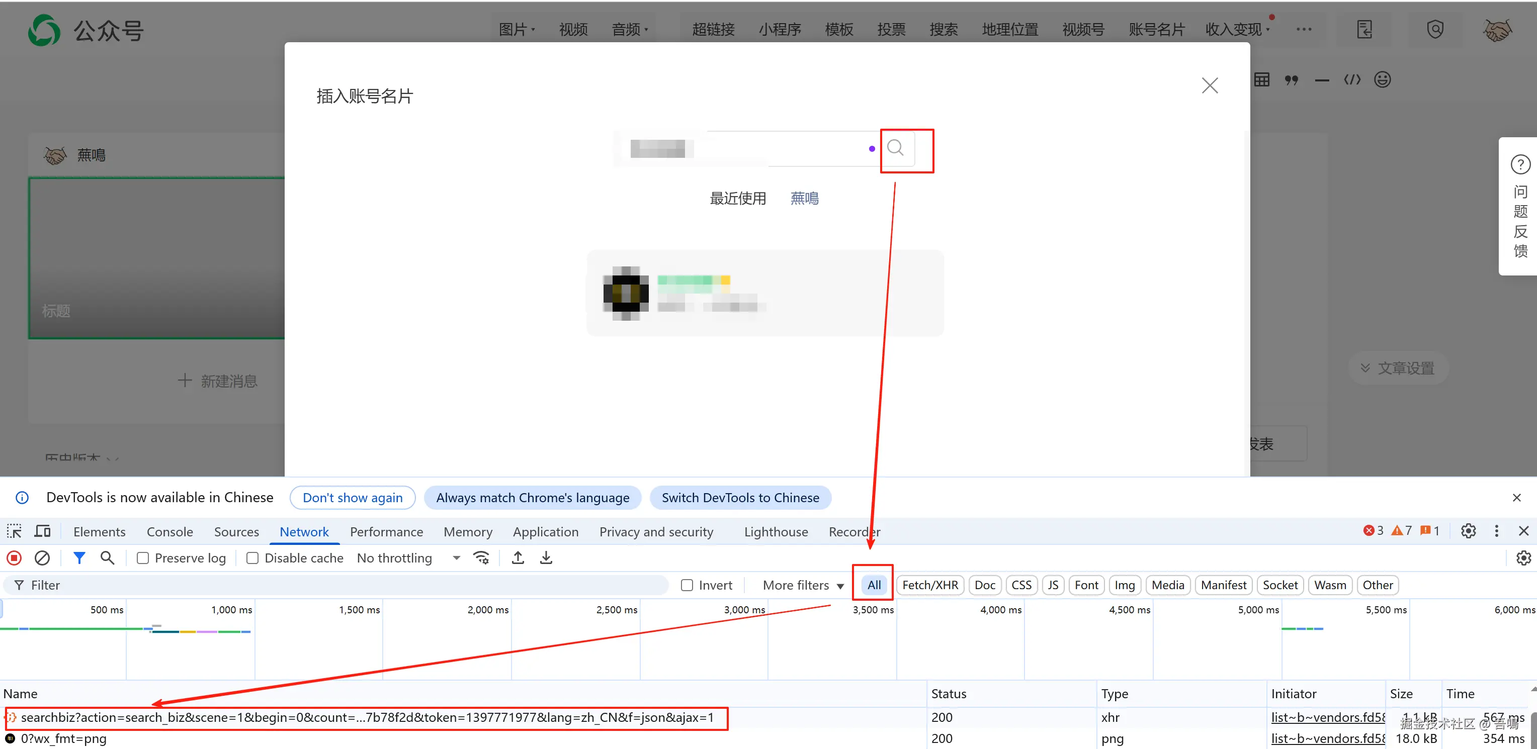 第四步:搜索框内容输入目标账号的昵称,然后点击搜索,找到“searchbiz”