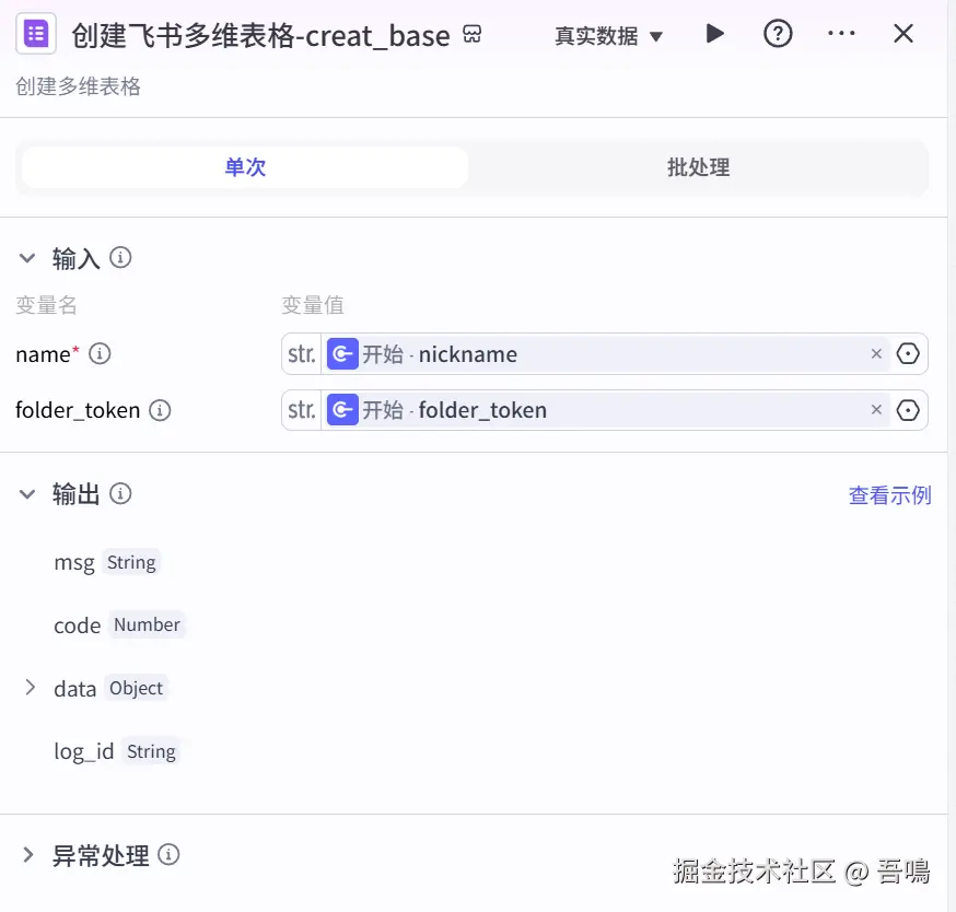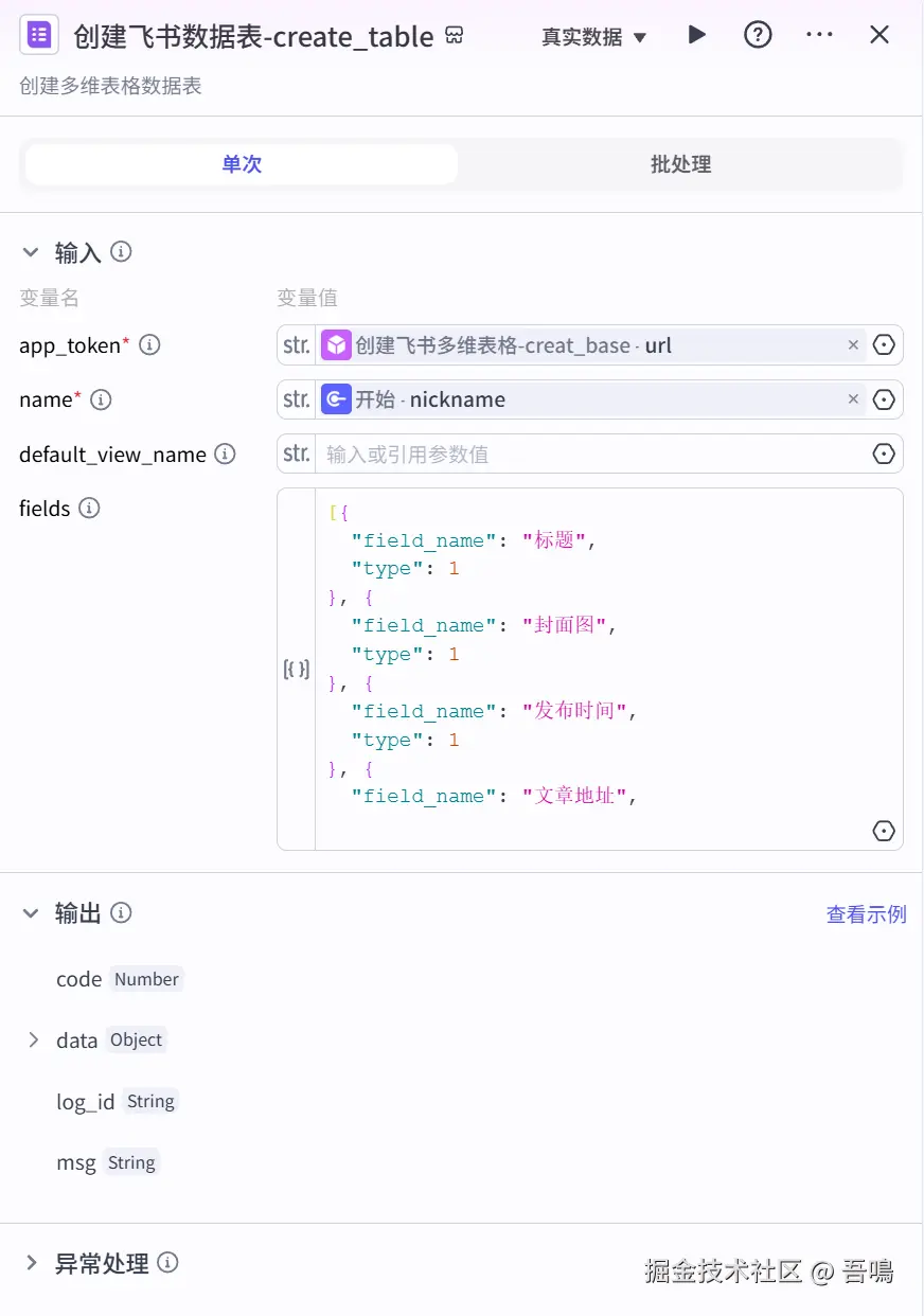 - app_token:引用“创建飞书多维表格”节点输出的“app_token”