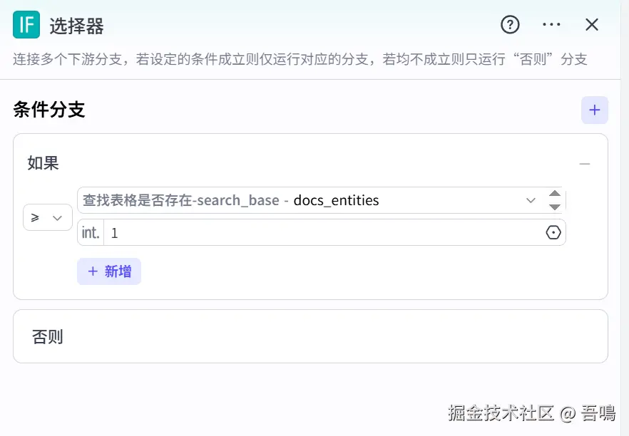 - 条件:通过判断“查找表格是否存在”节点输出的“docs_entities”长度大于等于1,大于等于1则不创建表格,否则创建飞书表格