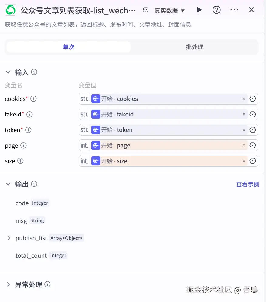 这个节点用户获取对标账号的文章列表,使用到了“获取公众号文章列表”插件的“list_wechat_article”工具,它使用到的参数如下: