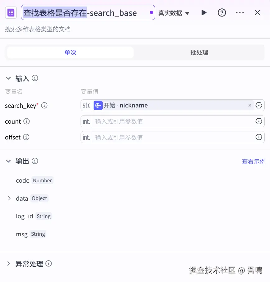这个节点的作用是查找飞书表格是否已经创建,已经创建了就直接执行添加数据到表格的流程,没有创建则执行创建表格再添加数据到表格流程。它使用到了“飞书多维表格”插件的“search_base”工具,使用到的参数如下: