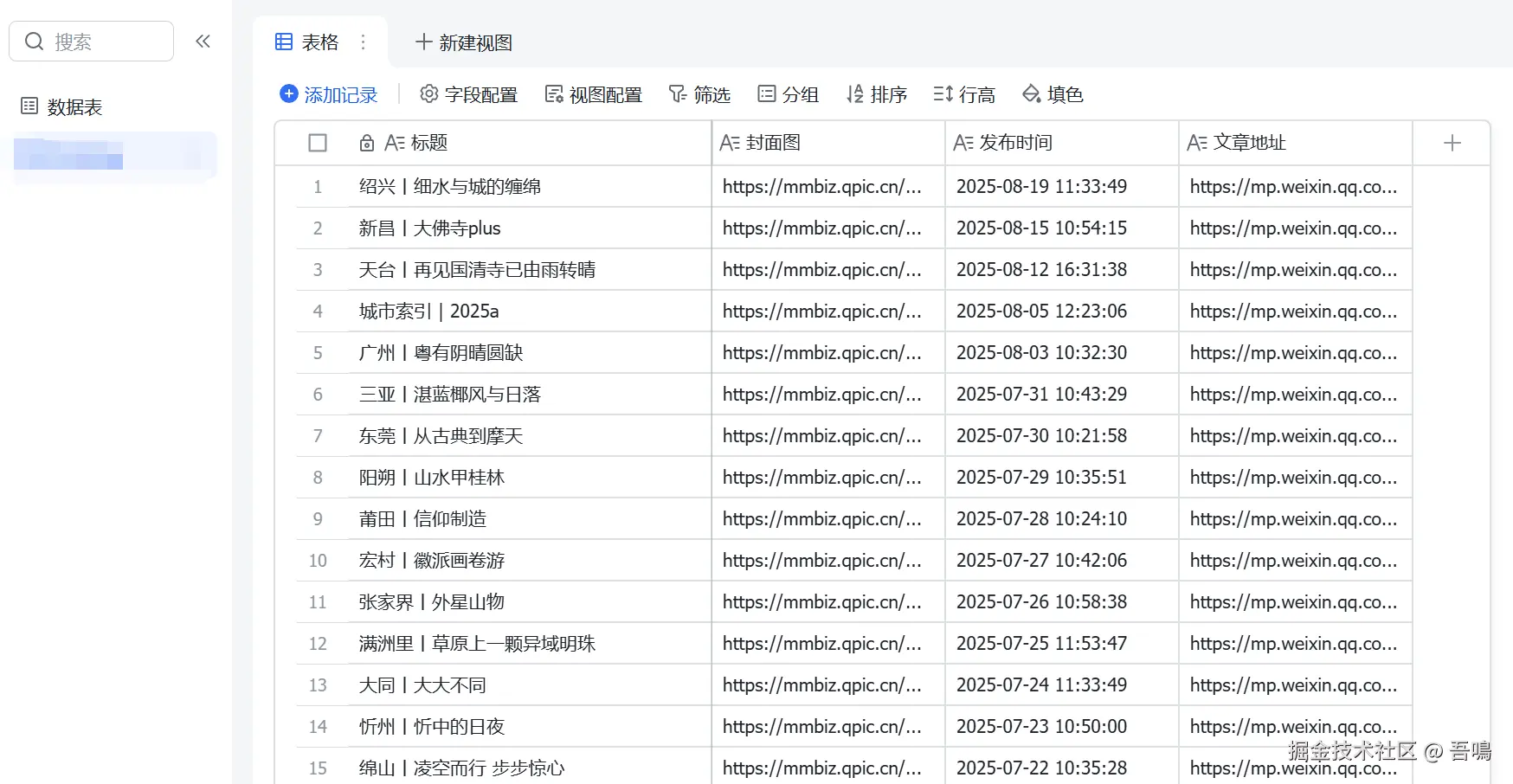 表格的名称为对标公众号的昵称,可以根据你想要采集的文章多少,不断地调整采集的页码,把文章追加到表格中。