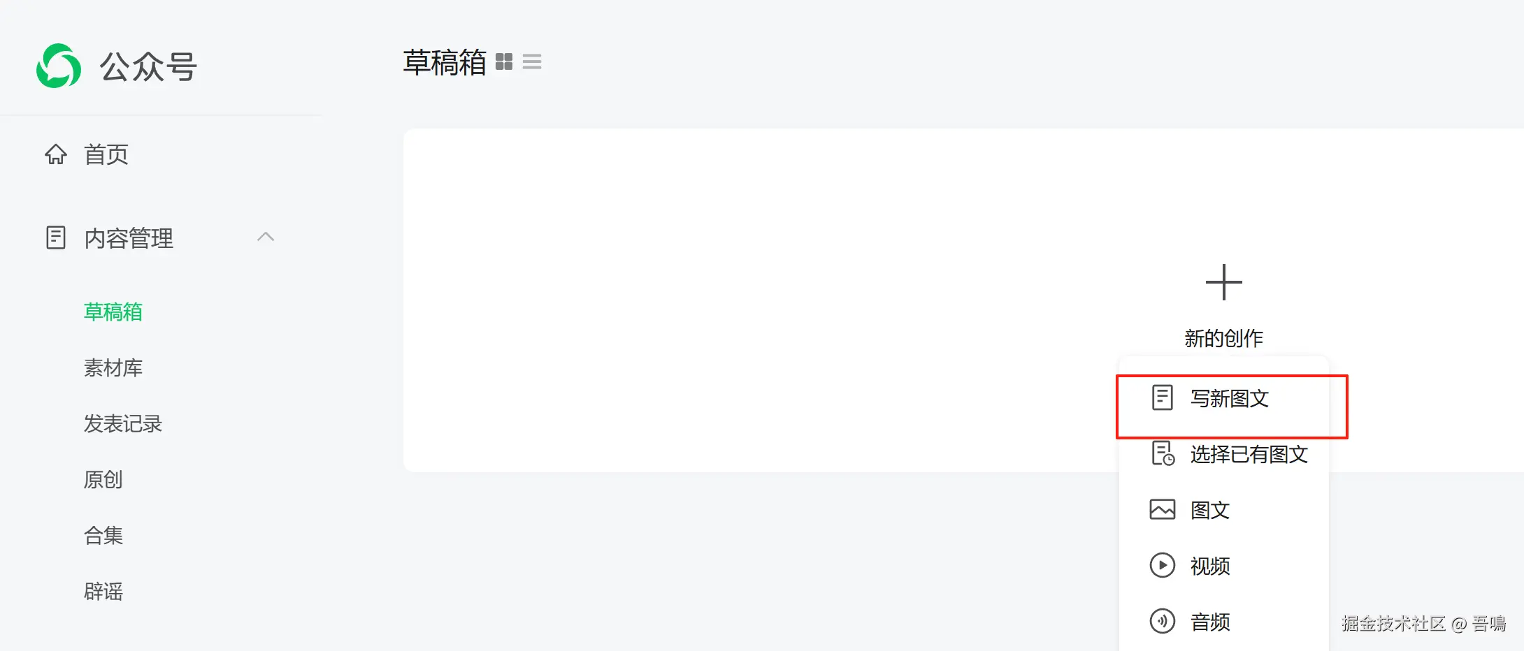 第一步:登录你的微信公众号后台,选择“草稿箱”,点击写新图文。