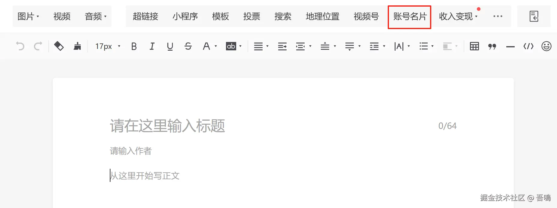第二步:进入写新图文的页面,点击右上角的“账号名片”按钮。
