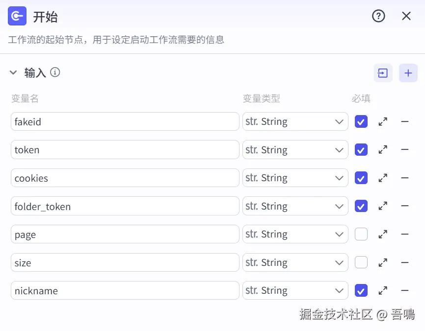 工作流开始节点输入的参数较多,但是其实有一部分是鉴权用的,另外一部分才是工作流真正的业务参数,下面将对参数做详解。