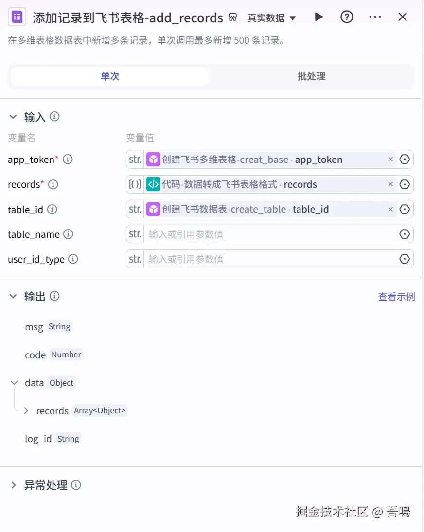 - records:需要添加的记录列表,引用“代码-数据转成飞书表格格式”节点输出的“records”