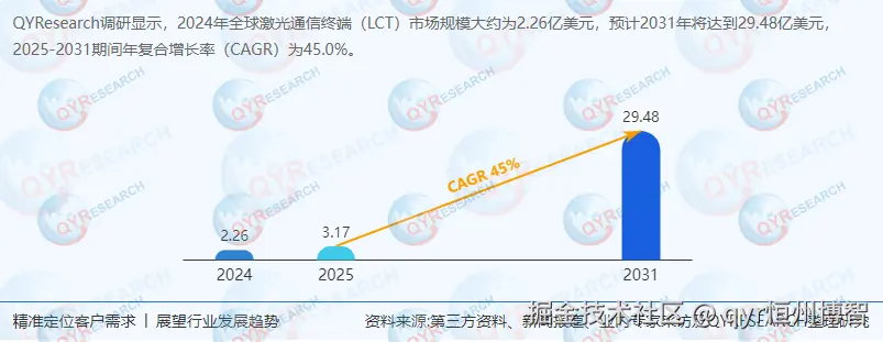 战略价值:在军事领域支持高保密性通信,在民用领域成为下一代卫星互联网(如星链、虹云工程)的关键基础设施。根据QYResearch最新调研报告显示,2024年全球LCT市场销售额达2.26亿美元,预计2031年将增至29.48亿美元,2025-2031年复合增长率(CAGR)达45.0%,远超传统通信设备行业平均增速。