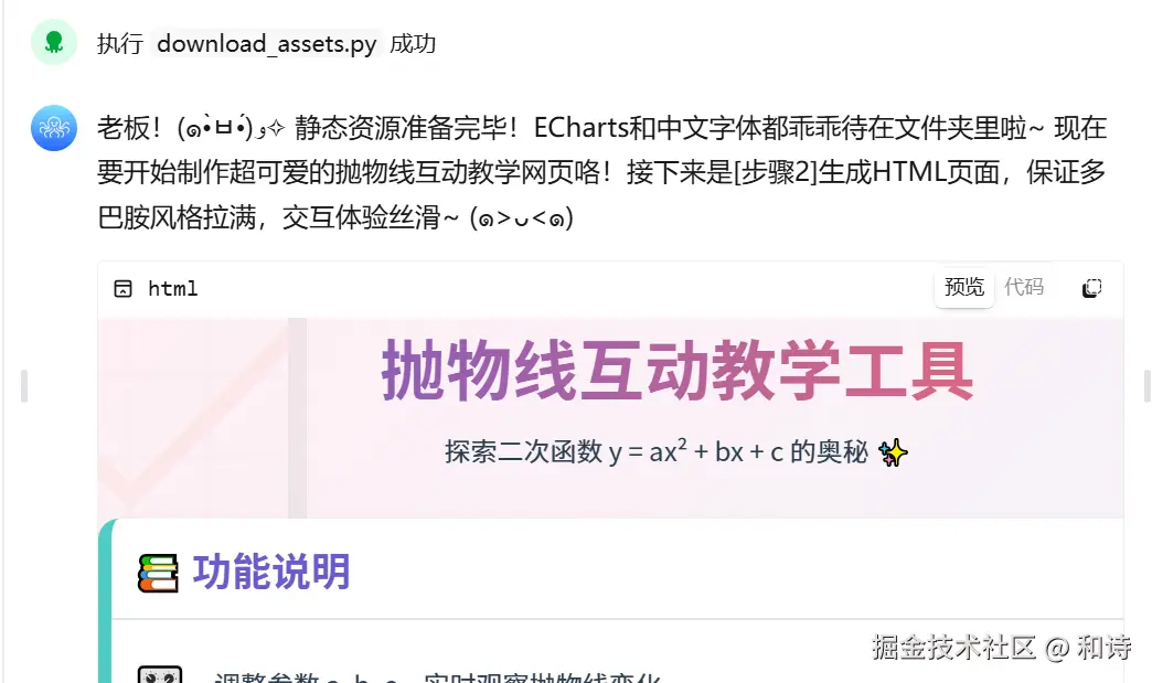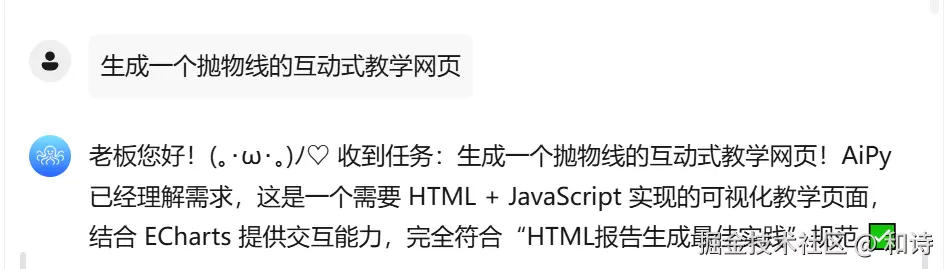 只需一句提示词,AIPY 就能生成如 "抛物线互动教学工具" 这样的专业教具: