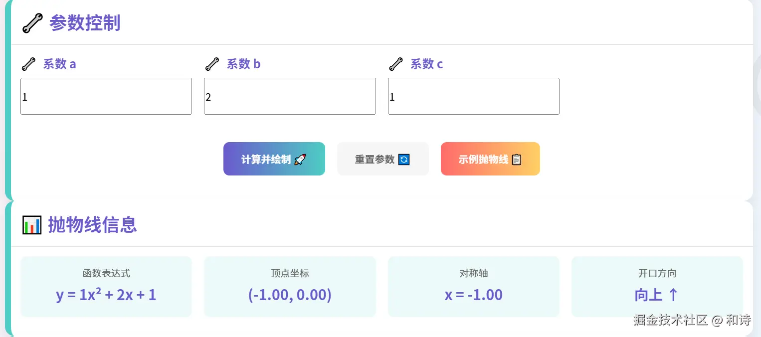拖动参数滑块,抛物线实时变形,顶点坐标、对称轴自动计算,开口方向动态标注。