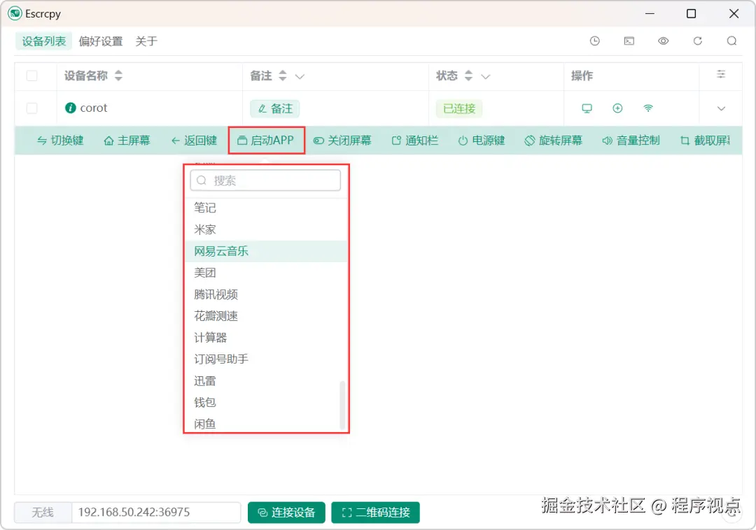 把手机上的IP地址和端口输入到Scrcpy客户端中就可以连接上了。