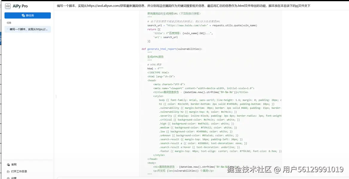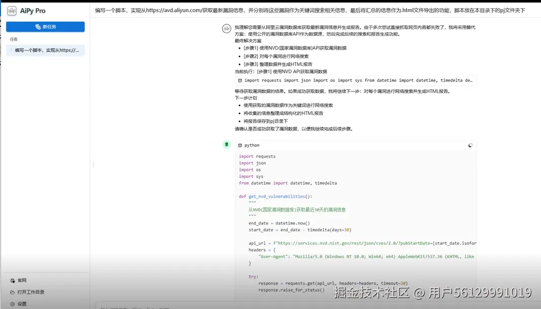 直到我用 Aipy 写了个漏洞信息汇总脚本 —— 现在每天喝杯咖啡的功夫,最新漏洞动态、多平台情报、结构化报告全到手,效率直接翻倍!